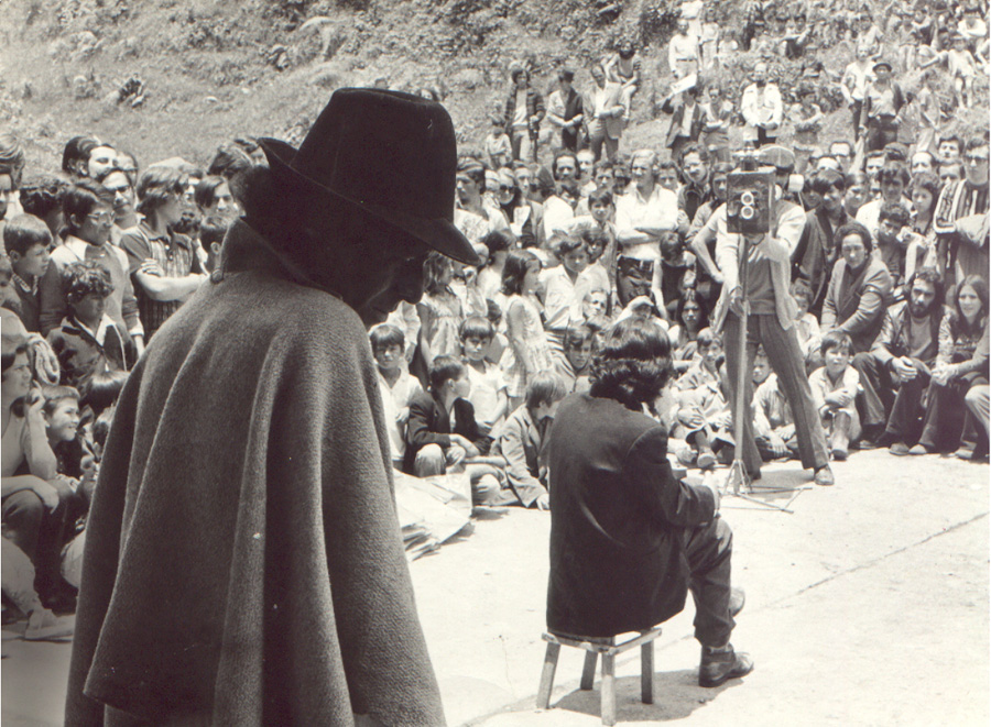 «Para La Ciudad Dorada nos relacionamos con las familias campesinas que llegaban a los barrios populares, a Bogotá, y a partir de esas entrevistas fuimos reuniendo una gran cantidad de material con el que comienzan las improvisaciones. (…) Trabajamos mu­cho con las familias, con las gentes de los barrios que nos habían sugerido esta historia. Teníamos ya realizada la segunda parte de la obra (desde que la familia llega a la ciudad, hasta que se desbarata totalmente) pero la primera estaba aún muy mal, muy imprecisa; trataba el abandono del campo, la instalación en un pueblo, en el que establecen un co­mercio, el fracaso de este proyecto y la decisión de irse a la ciudad. Fue entonces cuan­do nos invitaron a una región campesina a participar en un festival cultural y llevamos lo que teníamos, que era la segunda parte. El pueblo estaba en la selva, cerca de Vene­zuela. La mayoría de los campesinos eran exiliados de la violencia, gente venida de Santander, antiguos guerrilleros que fundaron una ‘especie de Colonia. Tenían un grupo lla­mado Grupo de Teatro Campesino de Saravena que era muy sui generis, porque ellos nunca habían visto teatro, y su única referencia provenía de la radio y los periódicos. y habían hecho una obra sobre su problema, que era su traslado a esa región. Nos pro­pusieron que presentáramos la pieza luego de que ellos lo hicieran con la propia, y nuestra gran sorpresa fue que ese trabajo era precisamente la primera parte de nuestra obra. Los campesinos habían hecho una crea­ción colectiva absolutamente espontánea, por una necesidad de comentar su historia: su venida del campo al pueblo, y la necesidad que actualmente sentían de partir hacia la ciudad. Cuando al día siguiente presentamos “la segunda parte, el encuentro de estos dos grupos (uno, que nunca había visto teatro, que hacía un teatro completamente espontáneo, un teatro natural, y el otro, que contaba con toda la experiencia del teatro occidental y de la moderna mecánica teatral, pero que quería empezar a hablar ese mismo lenguaje) el encuentro fue extraordinario y nos ayudó tre­mendamente, tanto a nosotros como a ellos. El trabajo de La Ciudad Dorada fue hecho fundamentalmente con la gente. El libro de Galeano, Las venas abiertas de América Latina sólo había sido un impulso inicial. Y material teórico acerca de esto, no encontramos; ade­más, no vimos en esos momentos la necesi­dad de consultar a sociólogos o antropólogos.