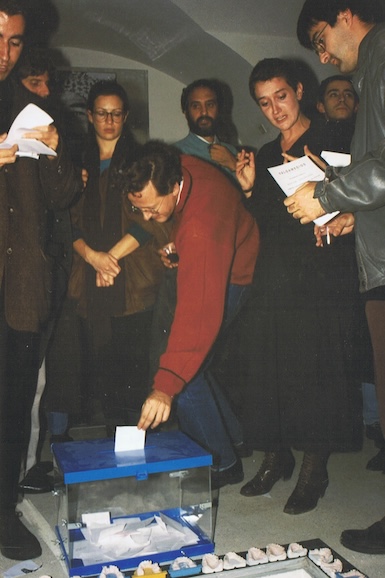 La acción destructora consistía en conectar una taladradora eléctrica para perforar el tomo de mil fotocopias. A continuación comenzaron a rasgar todas las hojas fotocopiadas introduciéndolas en la urna central. En esta fase el público podía participar en la destrucción. Inmediatamente después comenzaba el sorteo de la «obra de arte».