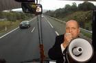 Río de Janeiro, Brasil. 2005.Leo Bassi permanece durante varias horas entre 5.000 fervorosos evangelistas que claman por Jesús con una enorme pancarta donde se puede leer: «No creo en Dios, pero sí en Socrates, en los científicos y en el amor: para más información, pregunten aquí».