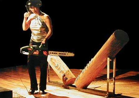 En algunas piezas he usado herramientas eléctricas para enfatizar la destrucción y construcción para investigar la posibilidad de modificar nuestra vida en un esfuerzo que implica ambos procesos. Si es importante para determinada acción, exalto la belleza del cuerpo femenino en contraste con herramientas como caladora, taladro o motosierra. Considero que el concepto de lo «femenino» – como construcción masculina – se rompe al usar herramientas manipuladas habitualmente por hombres.