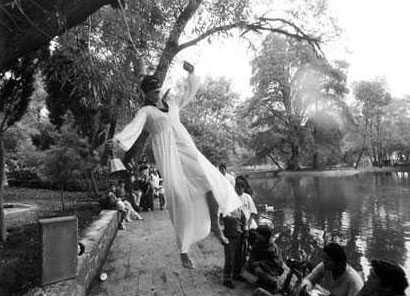 «El viaje mítico, no del héroe, sino de cualquiera, del primer humano, del último humano, el transcurso, el bagaje, el destino final… En esta pieza, que formó parte del evento ‘Parián de las Artes’, organizado por CONACULTA en el Bosque de Chapultepec, las condiciones estaban dadas por el carácter mismo del evento: la acción tenía que durar dos horas y ser continua. Yo trabajé el concepto de transcurso vital de un personaje cualquiera, que va transformándose y siendo ‘otros’ a lo largo del viaje que va dejando lastres y huellas de su devenir, y que al final elige su muerte en un acto de libertad y afirmación de identidad que concluye su transcurso vital. La última parte de la acción es la elección de ese árbol que sería su destino y donde colgaría la cuerda para ahorcarse. La utopía de elegir el momento y el lugar para terminar y jugar con la forma de esa muerte que, en el caso de esta acción, se trasciende porque ya colgado el personaje, sigue vivo en tanto tañe una campana de las que se usan en los camiones de la basura.» Katia Tirado.