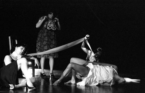 Siento que me expongo al peligro. Como si aullidos se escaparan de mi boca sin control. Como si estas imágenes se estrellaran contra el escenario haciéndome trizas. Dolores, placeres, miedos e ilusiones. Cuatro caricaturas. Mujeres de cuyas vidas sexuales podemos hablar desde sus muertes sexuales. Caprichos, se traga las ganas en el hastío de la rutina del matrimonio. Se seca las lágrimas con el delantal porque el látigo alcanza siempre su espalda. Luisa, la que se creyó los cuentos de hadas. Por temor a perder su virginidad, se la paso recortando muñecos e imaginando atardeceres en la pared. Se lo perdió todo. Raquel esconde su dolor en el acelerado e inexorable tic-tac de esta vida neurótica. Su tiempo se detiene solo para escuchar los ronquidos de la noche. Rosario fuma su pasado con la única esperanza de matar a sus fantasmas, los hombres a los que amo que solo le dejaron una peluca, un vestido negro y un cigarrillo en el corazón. Margarita, la pureza, cree en el amor. En el Tarot, ella tendría la carta del loco o del tonto. Fusión y fuga de lo pasado y presente, de risas y llantos. En escena, desnudos de entrega. Pétalos y piedras. Ritmos, aceleraciones, detenimientos, sudores y pérdida del hilo del discurso. Vendas que se tejen y destejen como esta historia que se repite, siempre. ¿Otra vez? Y ya dura mucho.