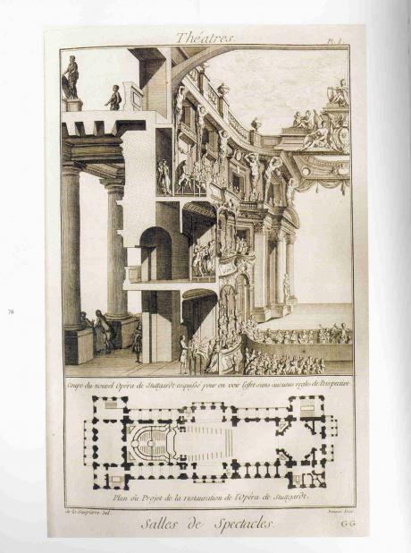 Así que el detallado estudio de la arquitectura teatral desarrollado en la Enciclopedia podría entenderse como una tentativa de arrebatar al poder absolutista la perspectiva central de acuerdo a la cual se construían los teatros barrocos y entregar al pueblo el privilegio de unas construcciones que elevaran a la condición de arte la actividad escénica, hasta entonces marginada en edificios precarios, sin por ello caer en los excesos de los espectáculos cortesanos. A lo que se aspira es a un edificio teatral donde, como ocurría en tiempo de los griegos, “los filósofos más famosos” no tuvieran reparo en venir “a explicar su doctrina”.