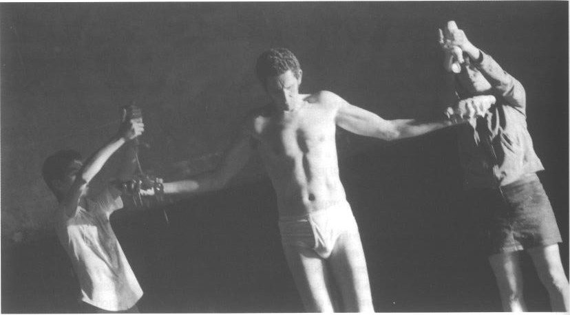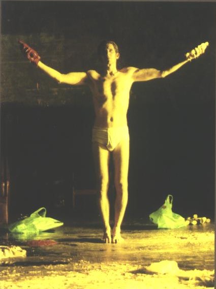 Transcurridos unos minutos descubrían un paquete de lasaña congelada o algún otro producto similar. Y mientras una cantante vestida de rojo y amarillo, a su lado, interpretaba un aria, ellos observaban cuidadosamente el producto, lo abrían, extraían su contenido. Los actores parecían personajes mutantes, surgidos de una secuencia de ciencia ficción, habitantes de un paisaje postnuclear ante una reliquia del pasado; sin embargo, se trataba de una acción que reproducía un comportamiento cotidiano en millones de hogares: la curiosidad, mezclada con reverencia, ante el nuevo producto alimenticio recién comprado en el hipermercado y que todos quieren inmediatamente probar. Esto es lo que hacían los actores, abrir la bolsa hermética y comer la masa y el relleno congelados, amasarlos en su boca, regurgitarlos en la propia mano, amasar la nueva mezcla, volver a masticar o bien pegarla sobre la camisa de un compañero, después en su cara…