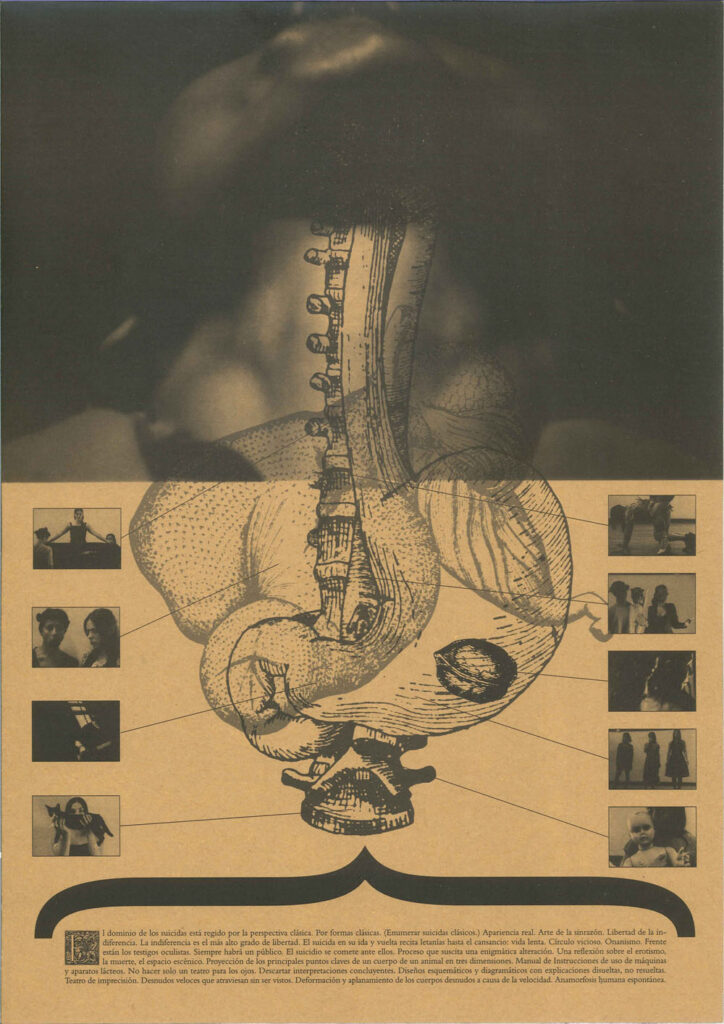 En esta obra se reduce la presencia de los muñecos a una función ilustrativa, casi a modo de cita, siguiendo de cerca la poética que por entonces había comenzado a desarrollar Veronese para sus trabajos en solitario. Contiene temas muy diversos, aparentemente deshilvanados, que pueblan el mundo de este autor, y su modo expositivo potencia esta estructura de libre asociación entre núcleos temáticos inconexos, algo que ya había utilizado en El líquido táctil Open house. En el programa de El suicidio se alude a esta estrategia compositiva basada en recursos de documental con el fin de introducir en la obra teatral la realidad en bruto: