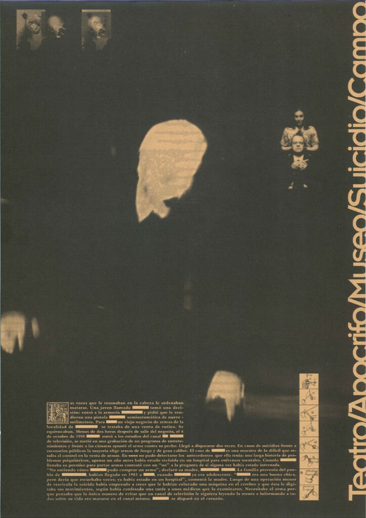 En esta obra se reduce la presencia de los muñecos a una función ilustrativa, casi a modo de cita, siguiendo de cerca la poética que por entonces había comenzado a desarrollar Veronese para sus trabajos en solitario. Contiene temas muy diversos, aparentemente deshilvanados, que pueblan el mundo de este autor, y su modo expositivo potencia esta estructura de libre asociación entre núcleos temáticos inconexos, algo que ya había utilizado en El líquido táctil u Open house. En el programa de El suicidio se alude a esta estrategia compositiva basada en recursos de documental con el fin de introducir en la obra teatral la realidad en bruto: