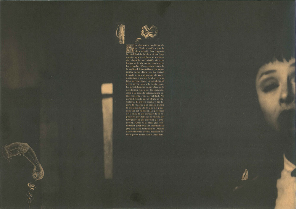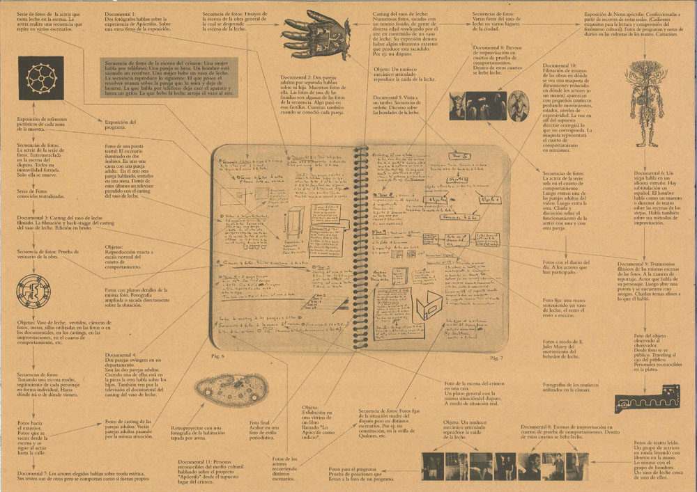 Lo Apócrifo será una serie de acontecimientos encadenados. En realidad no habrá obra en el sentido conservador de la palabra. Se desarrollará una trama que tendrá una coloratura de algo no programado, de accidente manejado. No habría necesidad de diagramar el espectáculo. El público frente a un testimonio: la emoción de ver algo verdadero. ¿Pero qué se verá? Se verán espectáculos con impronta de objetos ilimitados e inverificables. Postergar mientras se pueda una definición sobre el tema central que se desarrollará.