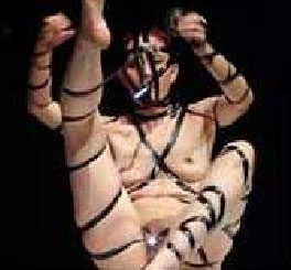 En el escenario, subo a una mesa circular giratoria. Prendo una lap top, pongo música psycho. Desenrollo la toalla, acomodo los instrumentos. Me quito las censuras. Introduzco una lámpara en mi boca y otra en la vagina y una vela encendida en el ano. Las pego a mi cuerpo con cinta negra, formando un traje sadomasoquista.