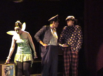 (Foto 7) Otra obra también presentada en el V Festival Internacional de Cabaret pero con características muy particulares es En el mundo de los medios el entero es rey, con texto de creación colectiva y dirección de Roam León Olvera. Actúan Paola Izquierdo, Isabel Almeida, el director y Gustavo García Proal. Roam León y Paola Izquierdo estudiaron teatro en la ENAT, han trabajado juntos en diversos espectáculos y hacen parte de lo que podría denominarse como la nueva generación del cabaret. Ambos también poseen una importante trayectoria en el teatro formal, por falta de un término mejor, y manifiestan haber incursionado en el cabaret porque les permite desarrollar inquietudes expresivas particulares y no por el aspecto económico. Cabe señalar que la obra que hoy comento se caracteriza por la integración de los diferentes lenguajes estéticos como son la música, el texto, la dramaturgia actoral y el uso de props. En el mundo de los medios el entero es rey es un espectáculo que pone en entredicho a los medios de comunicación y su influencia en la educación, los roles sociales y conductas de consumo. A través de personajes fantásticos enfrentados a la realidad cotidiana se plantea una crítica de modo aparentemente ingenuo e infantil, a la cultura consumista y estereotipada. Es de destacar también el uso de los elementos más tradicionales de la carpa. Entre ellos, la caracterización de personajes típicos de la vida urbana, el uso del lenguaje popular, al mismo tiempo que la ya mencionada técnica del clown, que aunque muy cercana a la carpa, casi no se usa en los espectáculos de cabaret contemporáneo. Muy lejos de ser sólo el equivalente anglosajón del término «payaso», es un lenguaje de gran sutileza, que construye una comunicación física y sicológica con el público a través de una gestualidad y de unas técnicas de construcción de la emoción muy particulares. En uno de los esketches, se presenta a un hada madrina bastante ingenua (interpretada por Paola Izquierdo), quien ha bajado a la tierra a cumplir los deseos de los seres humanos y que intenta hacer su trabajo, pero distorsiona los deseos al confundir el significado de las palabras. Por esta razón un hombre que le ha pedido varias cosas al oído (Gustavo García), se queja a un agente del servicio público (Roam León) que intenta comprender la situación. El hada en su defensa muestra que sí ha cumplido mostrándole una chaquetita negra de cuero, un fruto de mamey y una carta con el número 69.