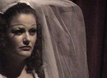 (Foto 8) Me detengo ahora en Pita en cuatro tiempos: juguete escénico cabareteado por una narcisa y un pianista cómplice (2007) con idea e investigación original de Leticia Pedrajo, escrita por Simone Vitoria y dirigida por Vanesa Ciangerotti, y quienes ya han colaborado en varias obras. En el V Festival participaron con Mitos, dichos y bichos, pero la particularidad de Pita frente a otros espectáculos ya mencionados caza mejor para los propósitos de este trabajo. Leticia y Vanessa tienen una formación teatral universitaria y han hecho teatro, cine y televisión. Simone se formó como dramaturga en la SOGEM y también actúa en televisión. Aunque todas tienen carreras bien establecidas, dicen que encuentran en el cabaret posibilidades de expresión y creación escasas en otro tipo de teatro o en los medios antes mencionados, y de hecho, Pedrajo menciona que la mejor salida económica y la falta de espacios teatrales para los actores mexicanos ha contribuido al auge del género. Otro dato de interés es que esta actriz estuvo en las ligas de improvisación con el director Alberto Lomnitz, lo cual le dio una soltura escénica que posteriormente iba a alimentar su trabajo en el cabaret. Pita en cuatro tiempos está estructurado en cuatro escenas cronológicamente invertidas que recrean la vida de la escritora, su infancia, su poesía, sus relaciones con Diego Rivera y su rivalidad con María Félix. Una mujer polifacética y contradictoria, adorable y temida, de gran relevancia en la historia de la cultura mexicana especialmente de mediados del siglo XX. La Pita de Pedrajo, a través de la escritura de Vitoria y la dirección de Ciangerotti, construye un personaje de gran riqueza por medio del cual logra quebrar el estereotipo de la locura como explicación última de los actos del ser egocéntrico y megalómano que Pita Amor hizo de sí misma. Aquí es releída como una rebelde frente a construcciones sociales tradicionales de la feminidad que todavía permanecen y se destacan sus angustias existenciales. La obra es un monólogo con grandes dosis de humor, que se desarrolla en contrapunto con la presencia de un pianista casi mudo. Resaltan las calidades histriónicas de la actriz en un trabajo que demanda una gran versatilidad, especialmente por el espacio tan íntimo en fue presentado (la pequeña sala de un bar en La Condesa, que le permitía al personaje apropiarse totalmente del mismo), al igual que un texto muy depurado por parte de la dramaturga.