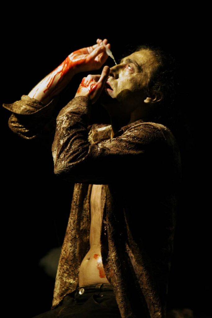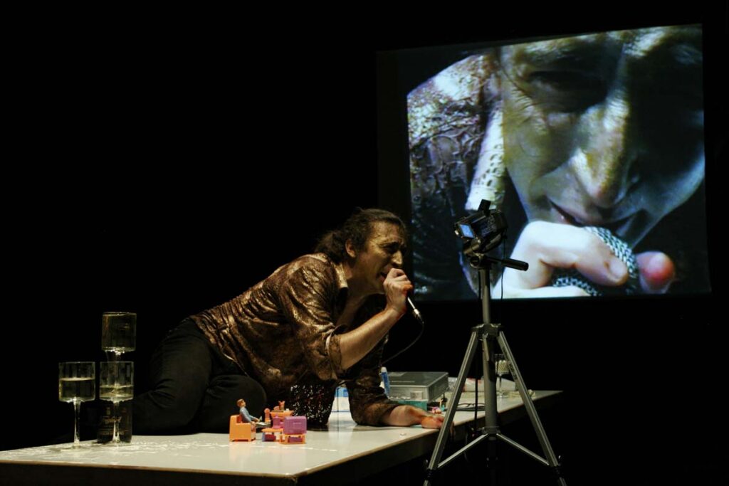 Melodrama comienza con el llanto desgarrado de Santiago Maravillas, que hace pensar en un personaje a mitad de camino entre estrella de rock y artista de la canción romántica. Su presencia física, afirmada sobre sí misma, contrasta con una actitud emocional extrema. No se trata de un personaje dramático, sino escénico, una potencia —diríamos más bien— puramente escénica, que se está constantemente construyendo, desde lo inmediato de la escena, pasando con rapidez de un lugar a otro, desde la expresión desconsolada del llanto a la explicación serena en primera persona de lo que le ocurre, de la balada de amor a la actitud punk, del tono intimista con el que implora perdón a la amada a la irreverencia física. (…)