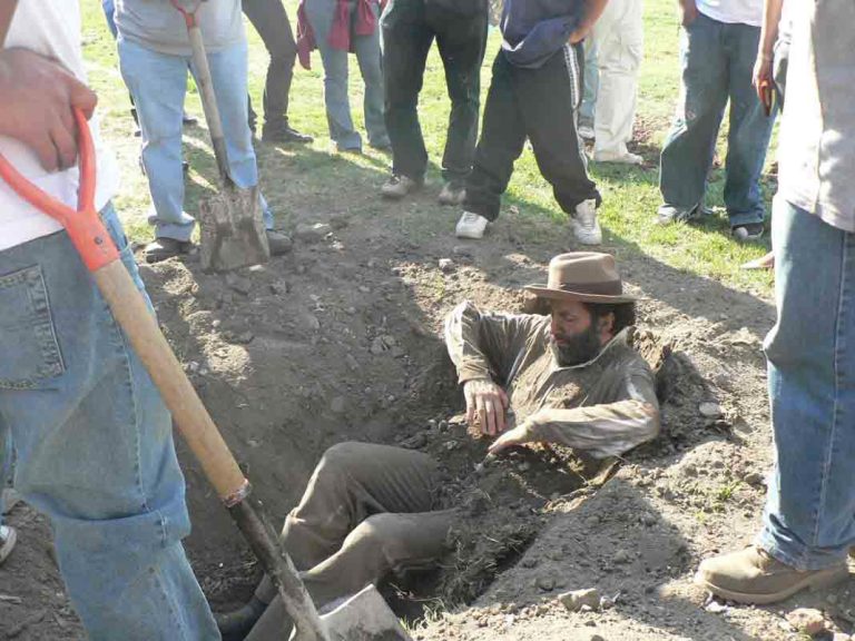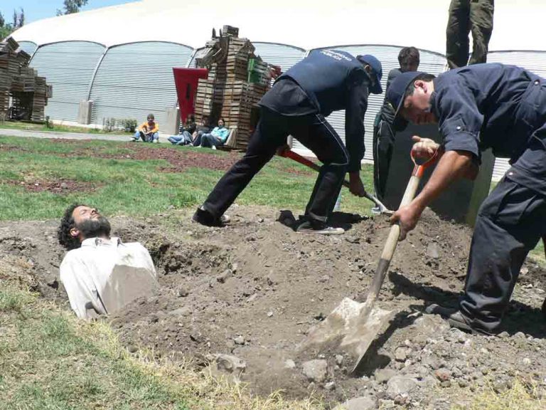 En el texto que circuló Villalobos anunciando la realización de Fosa, hacía referencia al enterramiento de cuerpos inertes en terrenos baldíos que convierten el campo en cementerio de fosas comunes, problema que ya es ordinario en las situaciones de conflictos armados y particularmente en Colombia. El sometimiento del cuerpo “con fuerza de voluntad”, coartando sus movimientos con el peso de la tierra en un tiempo y lugar específico, fue el presupuesto desde el cual se construyó esta acción-ofrenda.