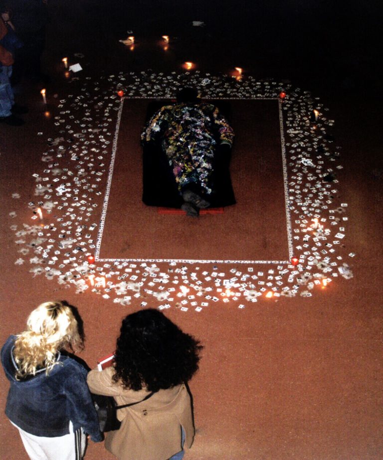 El trabajo de este artista ha privilegiado la instancia relacional con un uso mínimo de recursos escénicos y visuales, acotando el cuerpo a estados de quietud y silencio. Otras de sus acciones se realizan como intervenciones que buscan generar algún beneficio inmediato para comunidades en situaciones de precariedad o riesgo. Las acciones realizadas en la calle de El Cartucho, Bogotá, fueron conceptuadas como actos por la vida, como gesto de señalamiento contra el asesinato sistemático de indigentes(5). Sobre los muros del barrio se extendieron carteles con la frase: “En el mercado de la Indolencia. La muerte está demasiado barata”, los que fueron colocados en forma de cruces, a la manera de un viacrucis. Como en Prometeo (Mapa Teatro), los ejecutantes o performers reales fueron los propios habitantes de las calles de El Cartucho. Más allá de presumirse como obras artísticas, estas acciones son gestos éticos, actos de visibilidad. Construidas con recursos mínimos apuestan a la capacidad relacional y al efecto de convocatoria; su propósito no es la producción de objetos para la contemplación, buscando involucrar a las personas más allá de la condición de espectadores.