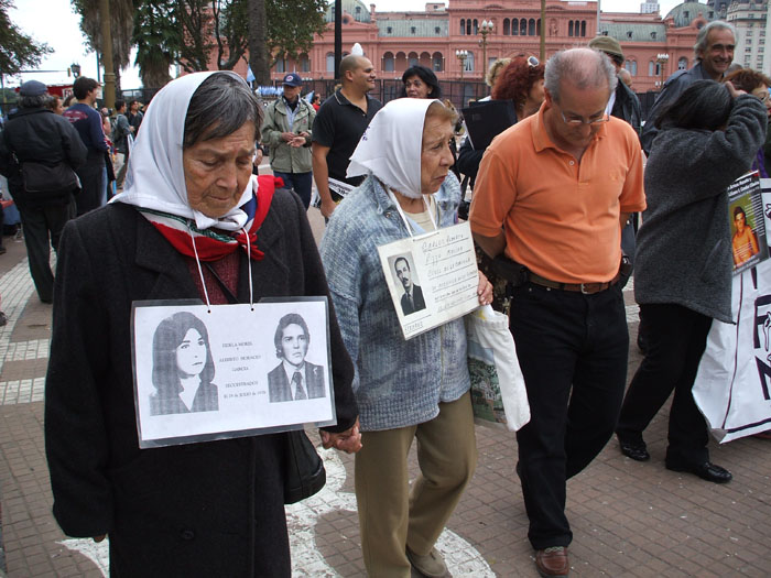 3. Las rondas de las Madres de Plaza de Mayo se iniciaron en abril de 1977. Luego de una larga peregrinación por cuarteles, comisarías y sacristías indagando por el destino de sus hijos, algunas madres decidieron comenzar a juntarse frente a la casa de gobierno, tomando la plaza para instalar públicamente la búsqueda. Portando las fotos de sus desaparecidos, con pañuelos blancos sobre la cabeza, comenzaron a realizar caminatas en torno a la pirámide, iniciando así la que ha sido considerada como “la mayor epopeya ética de la Argentina contemporánea”, y que hasta hoy continúa existiendo, aún después de la restauración de la democracia. Todos los jueves a las 3.30 de la tarde, las Madres hacen la ronda en torno a la pirámide de la Plaza de Mayo, frente a la casa de gobierno. En un país donde se impusieron las leyes del perdón a los militares implicados en las acciones de la Junta (Ley del Punto Final y Ley de la Obediencia Debida), esta protesta tiene un profundo sentido de resistencia, aún cuando en junio del 2005 la Corte Suprema de Justicia aprobó la anulación de estas leyes posibilitando la realización de algunos juicios a los militares responsables por las violaciones de los derechos humanos en Argentina entre 1976 y 1983.