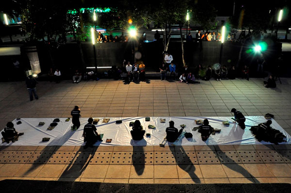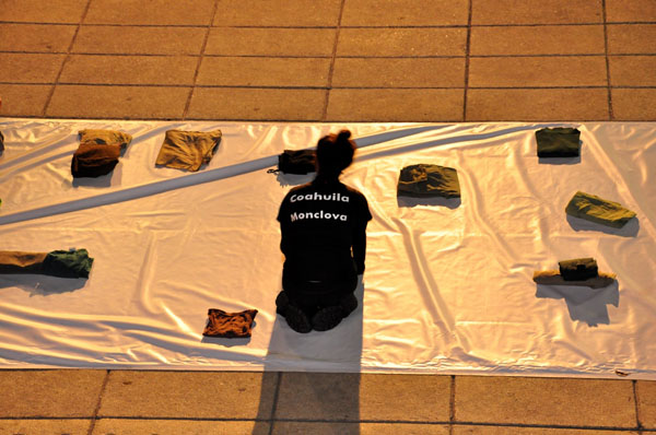 El tercer acercamiento fue una intervención escénica, titulada Ofrenda, donde se ocupo la arquitectura como escenografía, así como simbólicamente el habitar del tiempo especifico, la intervención se realizó el 1 de Septiembre del 2012 en el monumento a la revolución, fecha del último informe de Felipe Calderón. El eje central fue continuar trabajando con nuestra vulnerabilidad como ciudadanos mientras nos trasladamos por las carreteras de México para regresar a nuestros lugares origen, por lo que se convocó a la ciudadanía a participar en la intervención con la premisa de que vivieran en el D.F. y continuaran viajando por carreteras de México para regresar a sus lugares de origen, además de visualizar a los viajantes nos interesaba mostrar a los amigos y familiares que siempre esperan a que llegué su viajante o que regrese de su viaje, por ello se realizó una conexión en vivo desde el D.F, con familiares de los participantes y se documento con sus testimonios como había ido cambiando su lugar de origen a partir del contexto de violencia en México.
