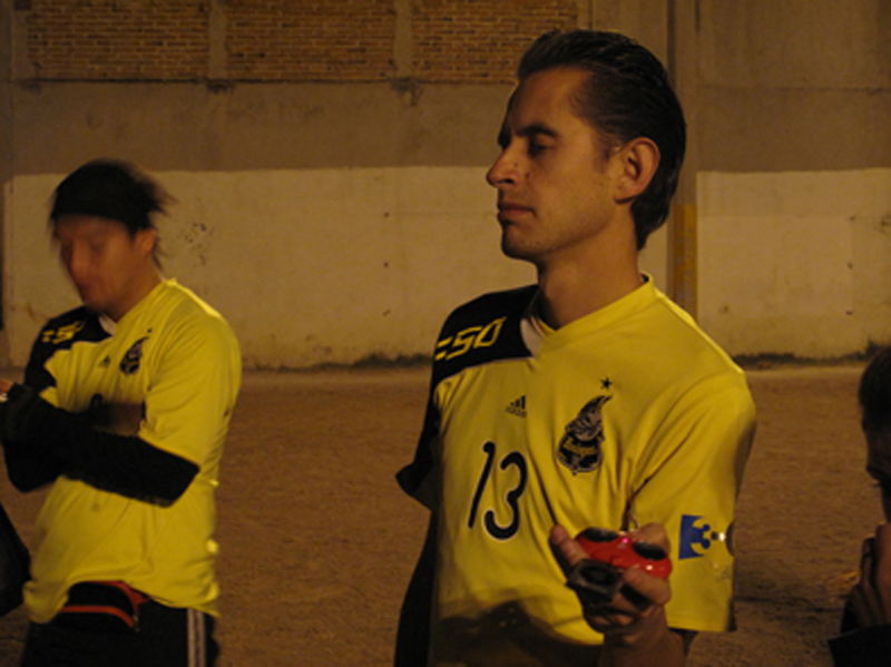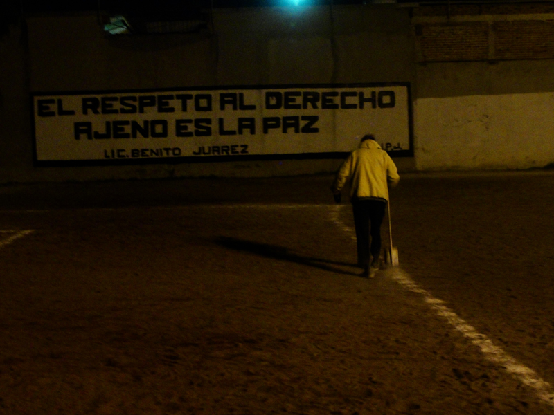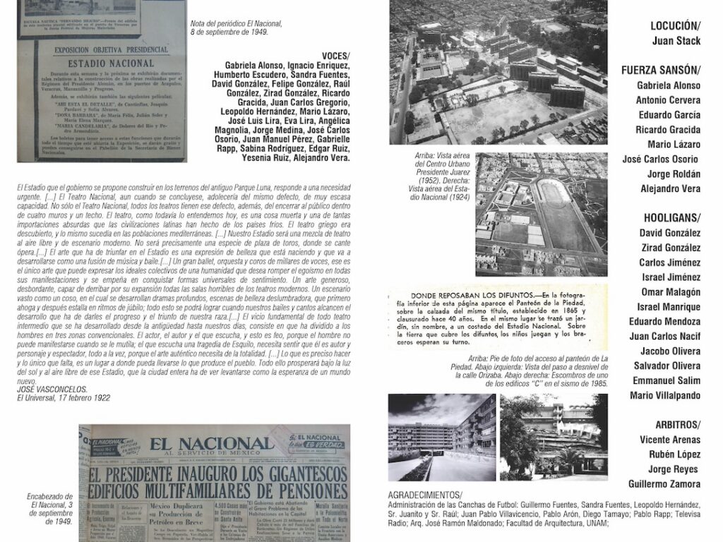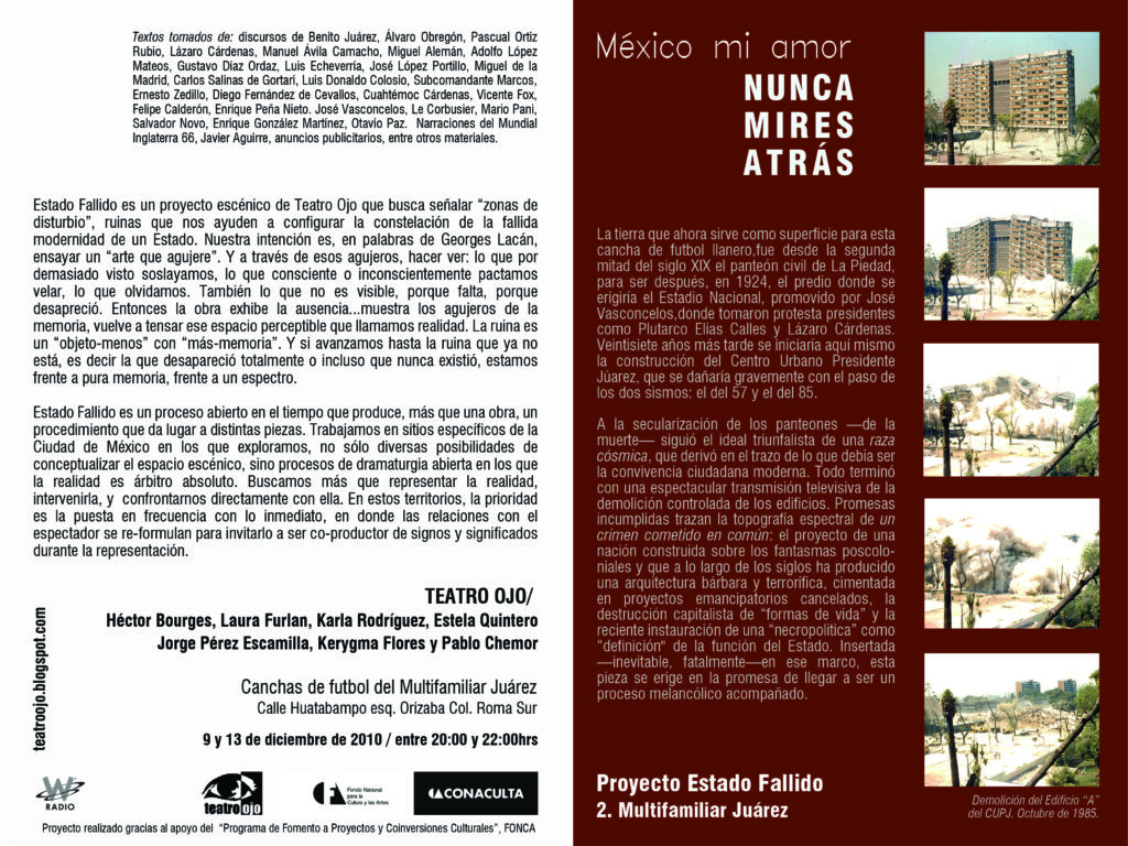 En diciembre de 2010, pocos meses después de la conmemoración del bicentenario de la independencia de México, el grupo Teatro Ojo invitó a dos equipos de fútbol de los Multifamiliares Juárez, en la colonia Roma de la Ciudad de México. Su intención era jugar un partido en las canchas que ocupan el espacio vacío que dejó la demolición de los edificios devastados por el terremoto de 1985. Así, en la pieza México mi amor, nunca mires atrás el espectador era invitado a ver el partido mientras un altavoz emitía tres tipos de discursos: el primero, era la narración de varios partidos que la selección mexicana, estando a punto de avanzar, fue eliminada en distintas Copas del Mundo; el segundo, era la narración televisiva que fue trasmitida en vivo durante la demolición de los edificios del multifamiliar que resultaron dañados por aquel sismo; y el tercero, una serie de comerciales y publicidad oficial. El árbitro interrumpía el partido y los jugadores se quedaban repentinamente inmóviles para que el público pudiera entrar al campo de juego y escuchar –por medio del reproductor mp3 que llevaban prendido a sus uniformes– el murmullo de las grabaciones de discursos vinculados con la historia del México moderno, pronunciados por políticos emblemáticos. Así, los espectadores tenían un “cuerpo a cuerpo” con los dispositivos del poder nacionalista. Por un lado, era posible oír epitafios, canciones, discursos presidenciales, himnos, declaraciones de guerra; y por el otro, enfrentarse a los cuerpos sudorosos de los herederos de ese terreno y de aquellos discursos. Sobra decir que los futbolistas desarrollaban su juego sobre el hueco que ha dejado la pérdida. De modo que la presencia de los jugadores silenciosos sobre un campo vacío “ponía en juego” la ausencia de los habitantes del multifamiliar en el contexto actual de la nación.
