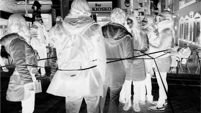 Radiografía n.º 3: Proposición de Brindis. Una persona en primer término hace una invitación al grupo. En segundo término otra capta con su cámara cómo está siendo esta propuesta recibida por el grupo.