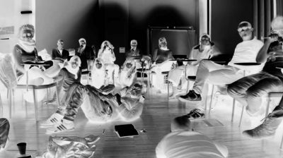 Radiografía n.º 1: Sosteniendo el vacío (ref. grupo estufa) El grupo se resiste desde sus sillas ante una supuesta inercia a la acción3. Algunas personas aparecen con la cabeza cortada.