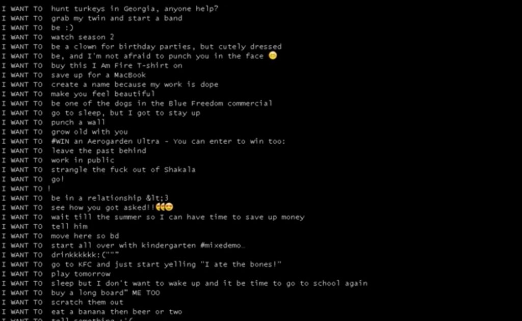 El proyecto se alimenta de las aportaciones a través de Twitter. Las frases que contienen “Quiero” son arrastradas desde Twitter, cortadas, alineadas y proyectadas. Cada frase es única tanto en su forma como en el contenido –desde los chats simples a los comentarios largos; desde observaciones generals a pensamientos personales; desde chistes graciosos a sentimientos profundos. En alguna ocasion aparece un emoticono que aporta una nota de humanidad a la fría pantalla en blanco y negro. La pieza en movimiento transmite una sensación de comunidad a través de lo que el mundo quiere en el mismo instante. El sentimiento de la pieza sera diferente un viernes por la tarde que un domingo por la mañana, muy diferente en un día de junio o de diciembre y diferente también el día de una tragedia o un día de vacaciones.