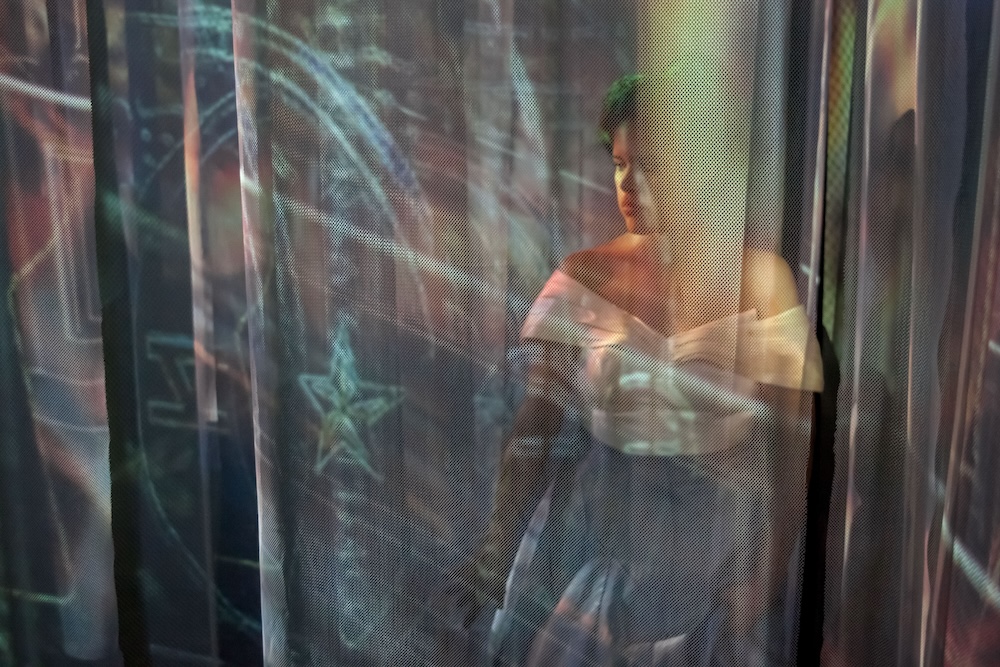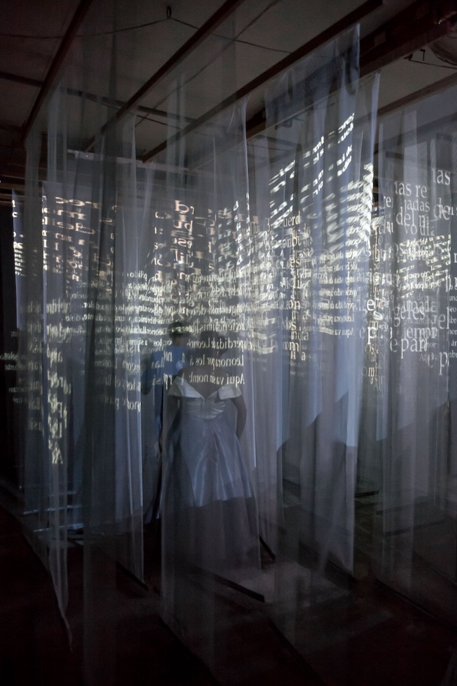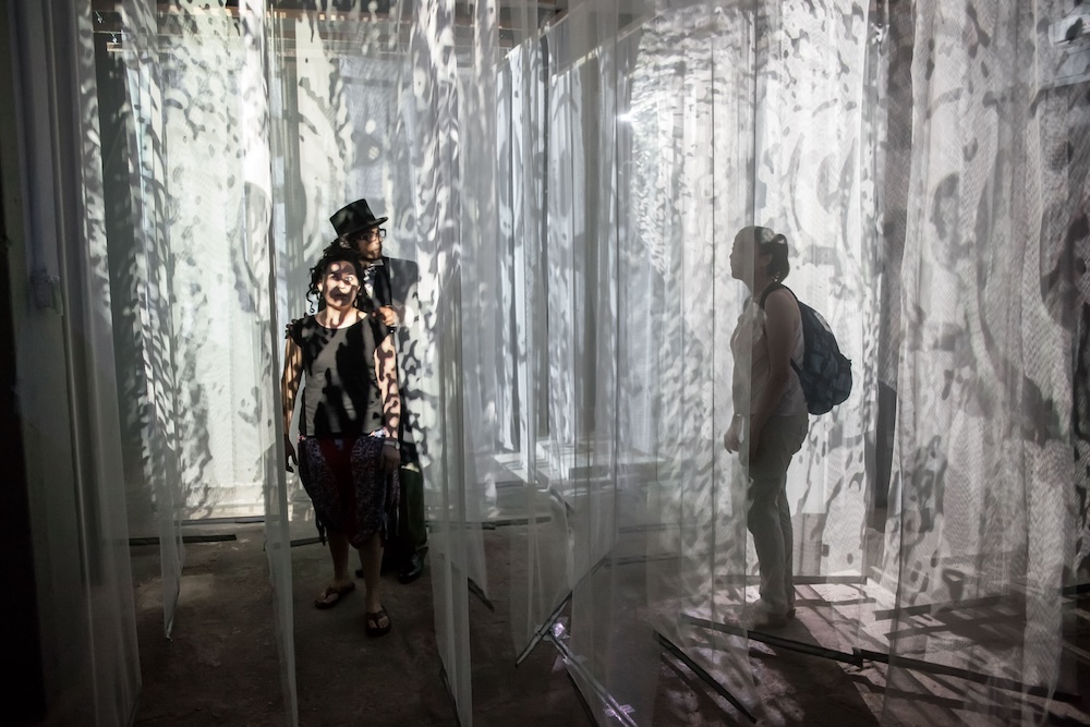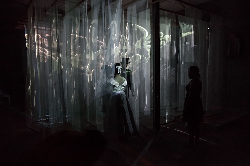 El dispositivo de “El Cuervo” consiste en un cubo de gasas de tela y cuatro proyectores cuyas imágenes en movimiento y sonidos crean un poema visual y sonoro. Los espectadores recorren el espacio de la mano de los actores.