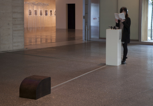 En el lugar del apuntador (2015) es una obra muy interesante tanto por su/s tema/s o su/s contenido/s como por la forma en que fue producida, ya que es fruto de una investigación y un proyecto llevados a cabo en el Laboratorio 987 por los artistas Silvia Zayas, Nilo Gallego y Chus Domínguez entre junio de 2013 y enero de 2014 en el MUSAC. El proyecto funcionó como un laboratorio móvil para investigar una heterogénea práctica artística denominada artes en vivo, para analizar la confluencia de dichas artes con las artes visuales y para poner en cuestión y/o colisión las dinámicas del “cubo blanco” museístico y de la “caja negra” escénica. Este proyecto formó parte del ciclo expositivo La forma y el querer- decir, comisariado por Leire Vergara, y en todo momento se mostró no tanto como una exposición estática cuanto como un verdadero proyecto colaborativo (en él intervinieron además de los tres artistas leoneses un buen número de profesionales muy variados), de investigación (con un punto de partida, pero sin objetivos prefijados) y evolutivo (tuvo varias fases a lo largo de los meses del proyecto y continuó más tarde con el objetivo de dar forma y hacer comunicables mediante una obra los contenidos y las aportaciones). A la hora de continuar el proyecto y generar una obra, la primera opción fue producir una película con el ingente material registrado. Pero una película cerrada de principio a fin resultaba incongruente dado el carácter abierto, evolutivo e interrogativo del propio proyecto. De ahí la pertinente pregunta que determinó un giro en la producción. ¿Cómo crear una película que siga viva y no quede eternamente cerrada en sí misma? Así, los artistas decidieron hacer una “película-acción” que escapa de la cinta estática, un film efímero y azaroso que cambia cada vez que se expone. El resultado es una instalación o “películaacción” en la que los dispositivos de registro (cámara y micrófono) no almacenan documento alguno, sino que recogen la azarosa realidad de la sala. En ellos se han insertado elementos fijos como el propio guión de la película (un libreto en papel y un guión en la película, confeccionado con partes o aportaciones registradas en el desarrollo del proyecto y que constituyen una especie de archivo o memoria) y elementos de ficción, tales como el sonido del apuntador y su cabina. Ese apuntador apunta al guión-libreto, cuestionando tanto el orden temporal como la frontera entre realidad y ficción. La voz que “sopla” parece ser anterior al archivo, y las voces grabadas se convierten en actores que interpretan el texto “apuntado”. La colisión de la voz del apuntador y del texto “apuntado” con la propia realidad de lo que ocurre en la sala hace que se pongan en cuestión el proyecto, la investigación, los participantes, los visitantes, la exposición y el propio museo, abriendo así una brecha en las convenciones del “cubo blanco” y del sistema del arte. En el lugar del apuntador, por Chus Domínguez, Nilo Gallego, Silvia Zayas, 2015, instalación, medidas variables, Colección MUSAC (Museo de Arte Contemporáneo de Castilla y León).