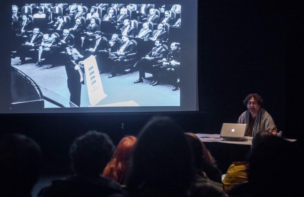 Desorganizar la mímesis es un espectáculo escénico en formato de conferencia con duración aproximada de una hora. Es un juego de palabras e imágenes en continua transformación que divagan sobre lo siguiente: