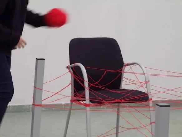 Trabajar con el arte conlleva situarse de alguna manera frente a la práctica artística. “Azul y Rojo” es una performance que trata de hacer visibles dos formas concretas de creación: la que parte de lo interior y la que trabaja con lo exterior. A partir de un punto, trazamos unos recorridos que el hilo hace físicos. Estos son los procesos que vienen y van, y que giran en torno a las obsesiones propias. Esta acción surgió a partir de comparar nuestras dinámicas de trabajo, las cuales son extrapolables a nuestra vida diaria. Como resultado se generan dos dibujos de naturalezas diferentes, que beben de un mismo problema: la maraña del arte.