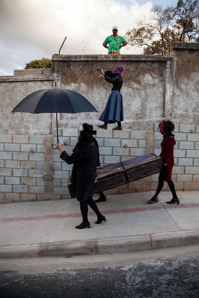 Uma coisa que interessava muito à gente era ver como aquele bairro, que era construído a partir dos ritos de morte, dialogava com essa história sobre a morte. Com essa história tão peculiar, de um corpo que some. Então interessava muito pra gente ver como a gente ia atingir o imaginário daquelas pessoas através daquela proposta.