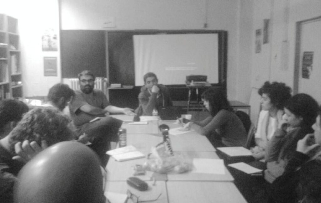 Fig. 5. Sesión “El afuera pasa adentro: del underground al 15-M”. Con Amador Fernández-Savater y Luis Navarro. Universidad Libre de Madrid. Fotografía de Kamen Nedev.