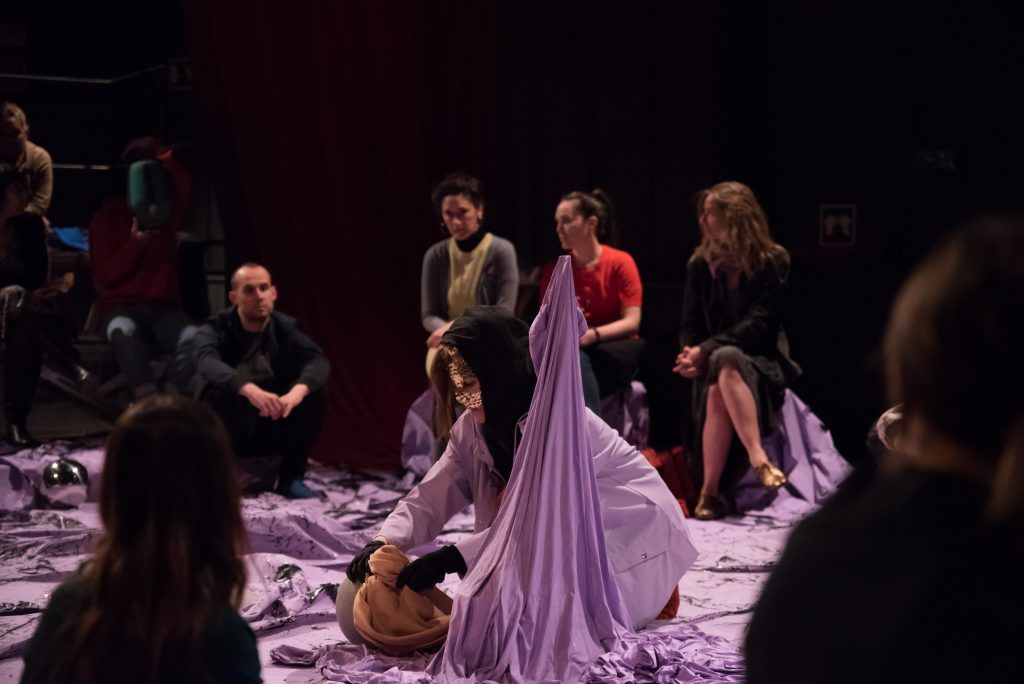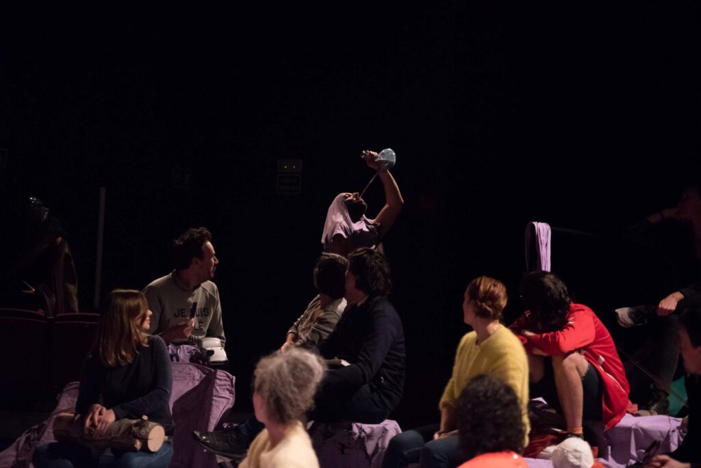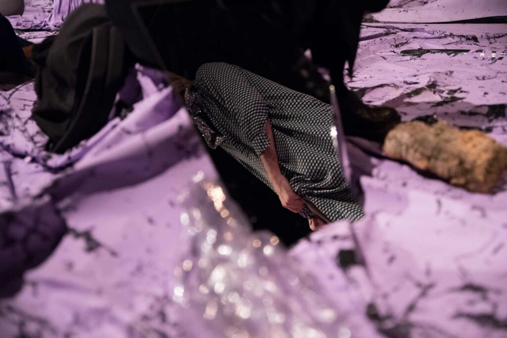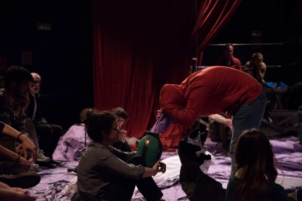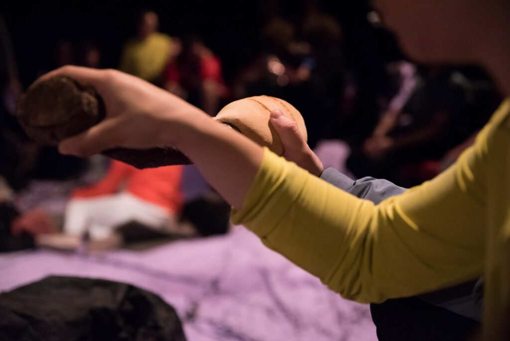 The Stain es un espacio de conocimiento compartido donde Maria Jerez ha trabajado con un carpintero, un panadero, un pintor, un compositor y un diseñador de luces. Un espacio donde desaparecen las clasificaciones firmes de la Modernidad, que tienden a separar el conocimiento en campos segregados. Un espacio inestable donde entidades de diferentes naturalezas coexisten y co-evolucionan en una coreografía de constantes encuentros con la otredad. La construcción de esta coreografía inestable, se centra en la idea de diseminación, desmembramiento, colonización, invasión, co-evolución, ensamblaje y convivencia como un marco de pensamiento desde el cual relacionar «cuerpos» o fragmentos de “cuerpos” que no están pensados para estar juntos. Entendiendo «cuerpos» como objetos, personas, textos, sonidos, materias, colores, atmósferas, espacios, tiempo, espectadores, artistas … La relación establecida entre estos «cuerpos» dispares no se basa en una relación «inteligente» que busca coherencia, sino por el contrario, busca la experiencia de un parentesco extraño. Este espacio que plantea The Stain es inestable y propone incertidumbre. El hecho de viajar a través de él, busca el desarrollo de una mirada aparentemente desordenada, donde el espectador cambia su estado porque lo que está mirando propone una multiplicidad de puntos de vista y modos de atención muy diferentes. De esta manera, el espectador podría dejar de ser un espectador «experto» en el que su rol como espectador pasa, de estar formado por contornos fijos y líneas duras, a aparecer como una amalgama de estados transitorios en los que un nuevo potencial de la mirada y del «estar juntos con» puede surgir. “Cuerpos que entran en otros cuerpos, esta mañana, cuerpos que no están pensados para estar juntos, estuve en la radio, seres de diferente naturaleza que cohabitan en un mismo espacio y me pregunté, coexistencia de la diferencia que crea fricción entre las distintas materias, si en la cocina de la persona que escucha la radio, cuerpos dentro de cuerpos, habría, trozos de cuerpos que salen de cuerpos, una planta, lógicas fuera de contexto, dicen, presencias fuera de lugar, que cuando, espacios invadidos por otras sustancias, las plantas, espacios de negociación, escuchan frecuencias bajas, espacios fronterizos, éstas, espacios de co-evolución, favorecen la germinación, espacios de cocción, el crecimiento, espacios de indiferencia y la salud de las raíces. Las altas, por el contrario, parecen tener un efecto inhibidor.