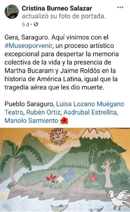 El MuseoPorVenir se vuelve itinerante: iremos a Zapotillo, a donde se dirigía el avión que llevaba a Jaime Roldós y Martha Bucaram; luego a Celica, donde el avión se estrelló y finalmente a Saraguro, donde la resistencia indígena se hermana con la lucha de Roldós. En cada lugar instalaremos el Cordel de la memoria y se pasará el documental «La muerte de Jaime Roldós».