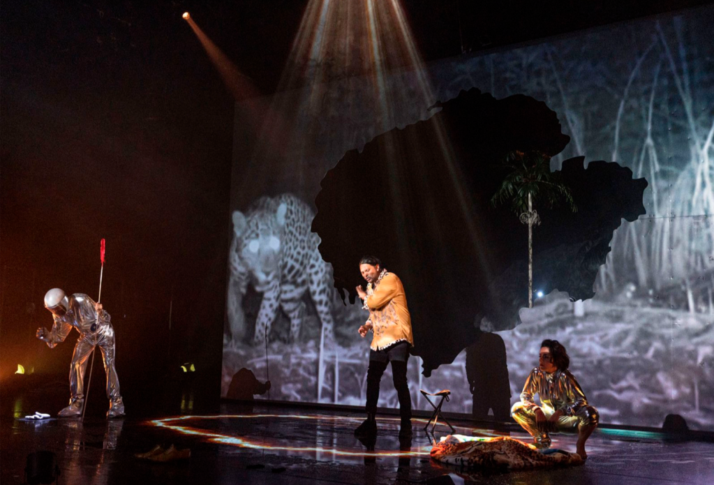 Andrés Castañeda me contó que, durante la creación de La luna en el Amazonas, en plena pandemia, él y Rolf viajaron a la frontera con Ecuador para visitar a un Taita de la comunidad Cofán llamado Taita Albertino Descanse. Un hombre nonagenario que vive a más de seis horas en lancha por el río San Miguel en la mitad de la selva amazónica. Convivieron con él durante varios días, conversando, tomando yagé, contando historias. “Fuimos con Rolf”, dice Andrés, “para de una alguna forma pedirle permiso a él y al territorio para nosotros poder hablar sobre su mundo, sobre el mundo de los chamanes, de los tigres, de las comunidades indígenas aisladas por autodeterminación, y también para que yo pudiera como actor desde mi oficio hablar de ellos”.2 Un largo viaje para hacer posible que Andrés prestara su cuerpo a la palabra del Taita. Pero desde entonces, ya Andrés no sabe si cuando está en un teatro sigue estando en la maloca. O si es un sueño lo que vive cuando actúa y en algún momento “hará amanecer”.