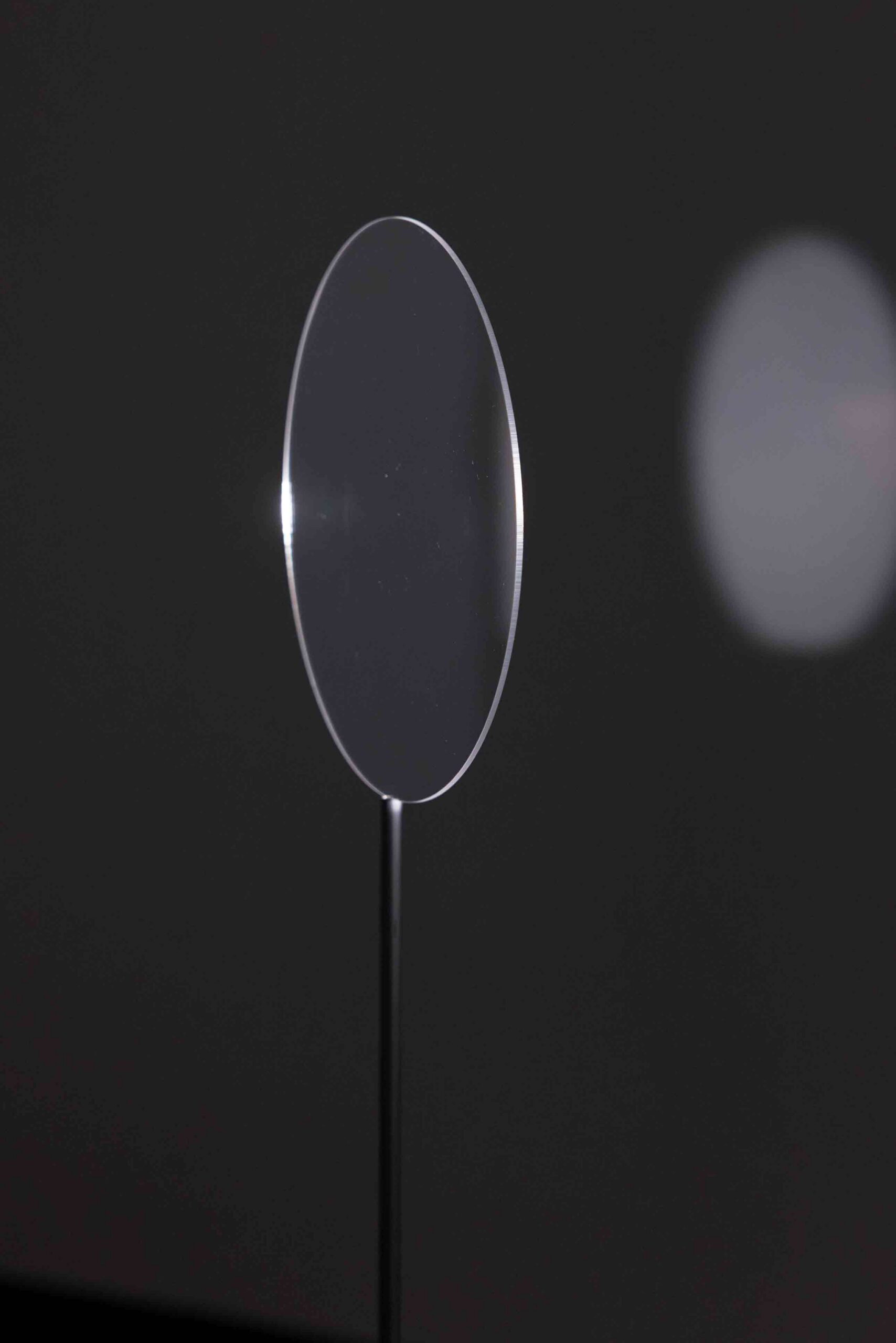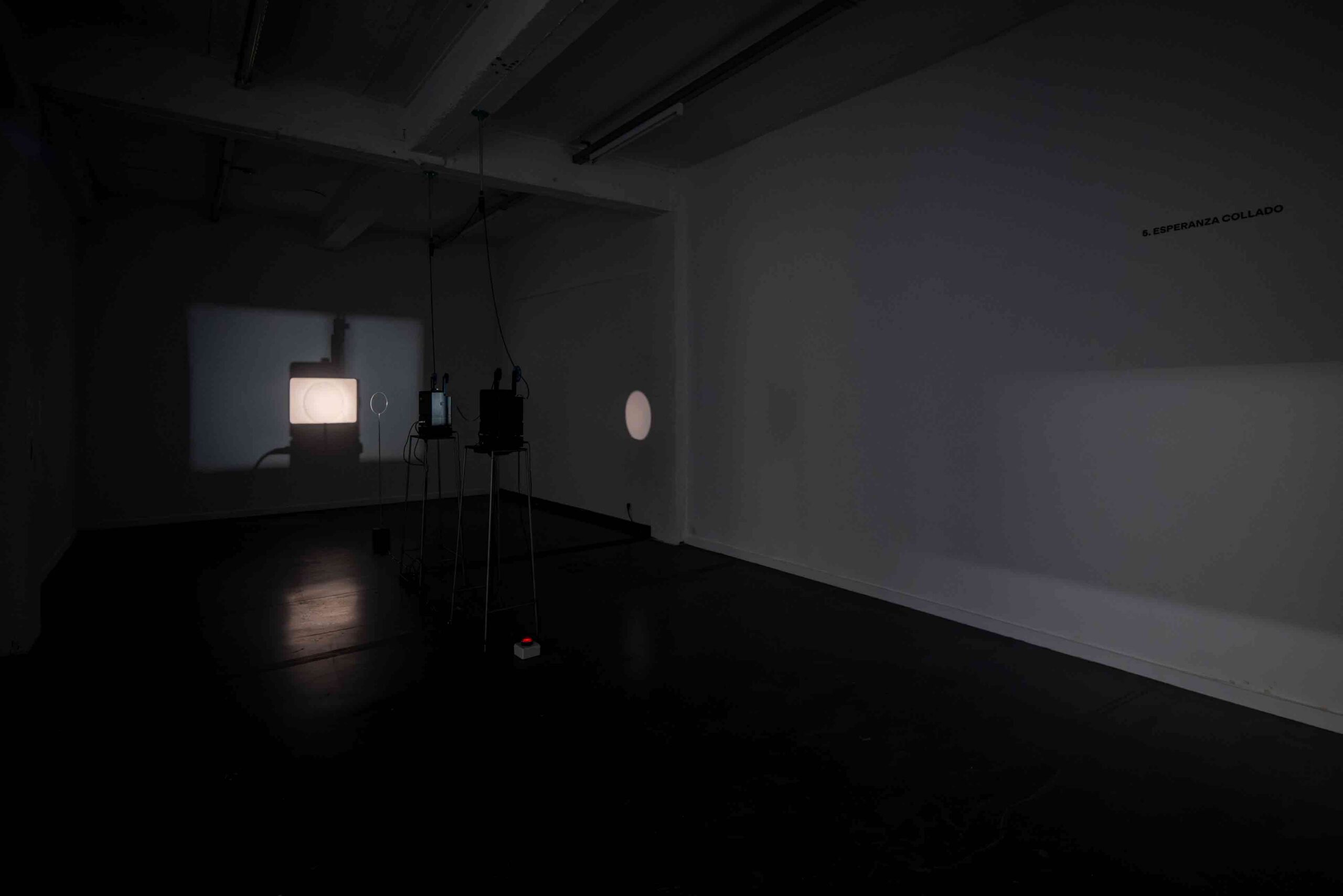La instalación consta de dos proyectores Super 8 mm dispuestos de forma concéntrica. El proyector trasero proyecta la sombra del proyector delantero, el cual, a su vez, proyecta su imagen dentro de su propia sombra. Esta configuración crea una situación de «mise en abyme» en la que la imagen y la sombra se inscriben en el mismo campo óptico, produciendo una paradoja visual que explora la autorreflexividad y la naturaleza dialéctica del cine. La instalación se completa con un disco giratorio que funciona tanto como pantalla como superficie reflectante. Este elemento dispersa la imagen proyectada por todo el espacio expositivo, sugiriendo una circulación desviada de la luz y evocando las observaciones de Zulueta sobre el desplazamiento espacial de la luz.