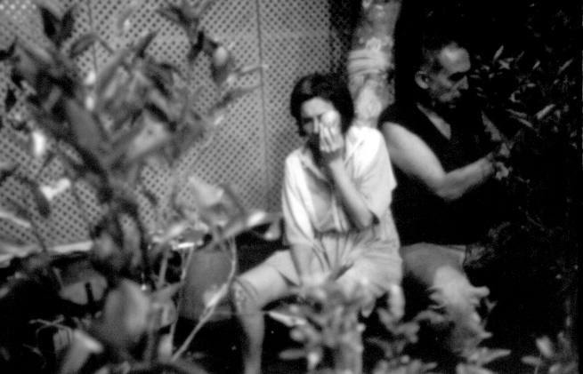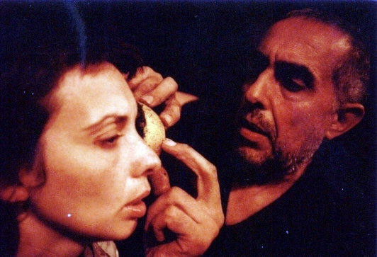 La obsesión de Dacia es conocer su historia, el relato de sus orígenes, una historia que está en poder del Padre, pues es el único testigo, el único que la puede contar. El acto de relatar esta trama viene unido a una precisa escenificación que vehicula —pone en escena— este acto de revelación (de la historia); la historia queda ritualizada de un extraño modo, tan preciso en su concreción como críptico en su abstracción: el Padre ha de subirse a un árbol y Dacia, abajo, debe usar un pullover verde. Como corresponde a la construcción críptica de la alegoría, también aquí el acto de relatar está ligado a un paseo que no lleva a ningún sitio, un relato sin final, o peor aún, que ya ha acabado. El cajón-confesionario-invernadero, de donde sale y entra el Padre, maestro de ceremonias de estos ceremoniales, carga de connotaciones este ritual, que como todos los ritos tiene que ver con la actualización de un tiempo pasado, un misterio que sólo puede revelarse de modo confesional y a cambio de un sacrificio. Esta imagen recurrente, junto con la del Padre regando a la Hija con zumo de naranja, sintetizan el deseo de que ésta crezca, como la propia cosecha de naranjas, cuyos árboles plantados en macetas ocupan el fondo del escenario, una presencia de algo natural que termina adquiriendo, como corresponde a las alegorías, una proyección simbólica, pero sin agotarse en ésta, como lo real en Lacan. Este plano se cruza con la historia de los orígenes, el punto ciego sobre el que avanza la representación: la naturaleza enferma de la historia y la historia de esa naturaleza parecen superponerse.
