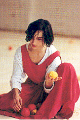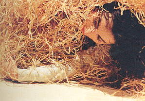 Las muñecas rusas carecen de hueco. Para ahuecarlas, es preciso abrirlas, descomponerlas, dispersarlas, privarlas de su definición. El cuerpo no se puede descomponer, pero sí se puede agitar hasta su conversión en sombra, en línea, en instante, y también se puede proyectar: las naranjas y manzanas, con toda la carga de sensualidad que su olor refuerza, son proyecciones de una dimensión del cuerpo, que busca su forma en el heno con una indolencia que no le es dado practicar en el espacio vacío o en relación con las formas rígidas del diseño o la arquitectura. En las proyecciones y en las huellas, en los objetos escénicos, el cuerpo se busca a sí mismo, busca su imagen con la misma obsesión que mediante el movimiento ahueca el espacio para abolirla y crear el lugar de la interioridad prohibida.