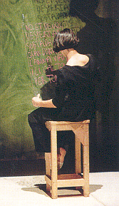 «No debo despertarte demasiado bruscamente -escribía Margarit en un momento del espectáculo- porque tu alma está de viaje mientras duermes. Debo darle tiempo para que regrese al cuerpo».Una luz verde atravesaba el metacrilato donde las letras eran escritas y se proyectaban ampliadas sobre el fondo, legibles entonces para el espectador. Margarit nunca lo olvidaba a pesar de la aparente dirección centrípeta de su movimiento. Era para el espectador para quien componía ese dibujo que sólo su mirada podía fijar, y el solo en su conjunto era también la invitación a un solitario que cada persona del público podía resolver o dejar abierto. El juego consistía en trazar imaginariamente las líneas que unían los elementos y objetos que Margarit iba introduciendo en escena y dispersando en su constante girar, que ahora se descubría centrífugo. Los objetos configuraban fragmentariamente un universo poético, íntimamente ligado a la memoria del cuerpo, que sólo asociativamente le era dado descubrir al espectador.