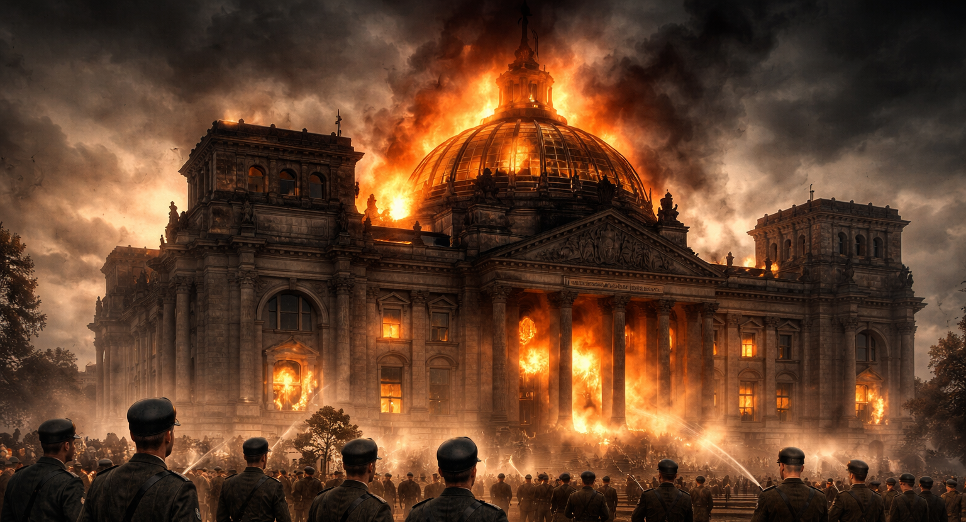 Incendio del Reichstag (Parlamento Federal de Alemania) en 1933. [Imagen elaborada con ChatGPT 5.2]