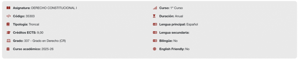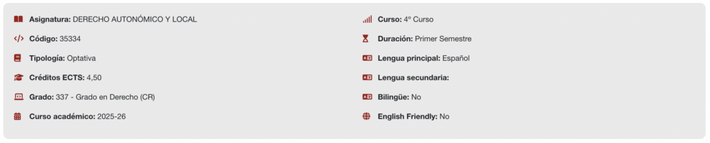 Derecho autonómico y local (impartida con el área de Derecho Administrativo) – Cuarto curso – optativa – 4,5 créditos