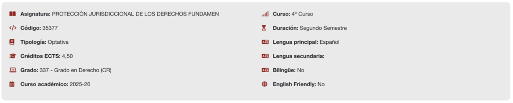 Protección jurisdiccional de los Derechos Fundamentales (impartida con el área de Derecho Procesal) – Cuarto curso – optativa – 4,5 créditos