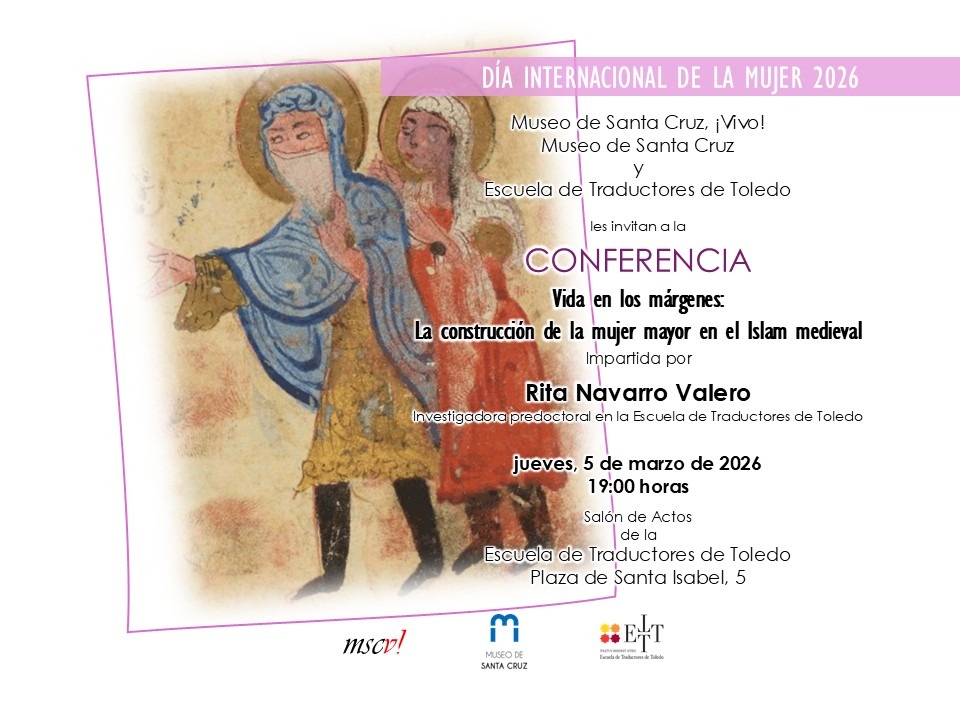 Con motivo del Día Internacional de la Mujer 2026, el Museo de Santa Cruz, ¡Vivo!, Museo de Santa Cruz y La Escuela de Traductores de Toledo, tiene el gusto de invitarles a la Conferencia: «Vida en los márgenes: La construcción de la mujer mayor en el Islam medieval», impartida por Rita Navarro Valero, el jueves, 5 de marzo de 2026, a las 19.00h, en el Salón de Actos de la Escuela de Traductores (Plaza Santa Isabel, 5). Entrada gratuita, hasta completar aforo.