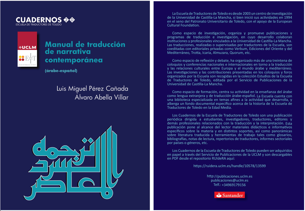 Bajo el título Manual de traducción de narrativa contemporánea (árabe-español), la Escuela de Traductores de Toledo (UCLM) acaba de publicar el número 20 de su colección Cuadernos / Escuela de Traductores de Toledo, 20. Servicio de Publicaciones / Universidad de Castilla-La Mancha, 2016,156 págs. ISBN: 978-84-09-17296-2.