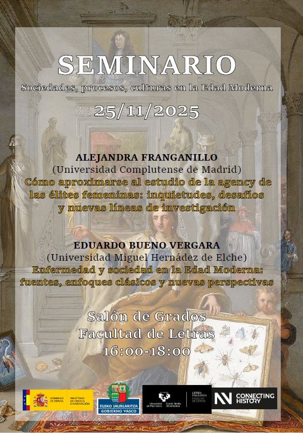 Seminario «Sociedades, procesos, culturas en la Edad Moderna». Martes, 25 de noviembre a las 16:00 en el Salón de Grados de la Facultad de Letras de la UPV/EHU. Intervienen Alejandra Franganillo (UCM) y Eduardo Bueno (U Miguel Hernández de Elche). El evento de celebrará en el Salón de Grados de la Facultad de Letras de la UPV/EHU, en Vitoria.