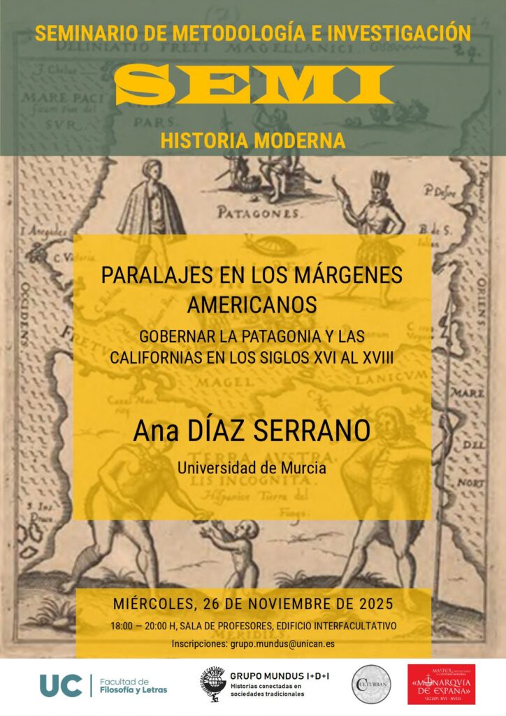 Dentro del ciclo de Seminarios de Metodología e Investigación XVI SEMI 2025-26 organizado por el Grupo Mundus I+D+I. Historias Conectadas en Sociedades Tradicionales de la Universidad de Cantabria. El próximo miércoles 26 de noviembre a las 18.00, la profesora Ana DÍAZ SERRANO de la Universidad de Murcia nos presentará la conferencia en la sala de Profesores del Edificio Interfacultativo el tema “Paralajes en los márgenes americanos. Gobernar la Patagonia y las Californias en los siglos XVI al XVIII”. Os adjuntamos el cartel informativo a la espera de que os resulte interesante. Tenéis más información en la página web. https://gmundus.unican.es/semi/xvi-semi-2025-2026/