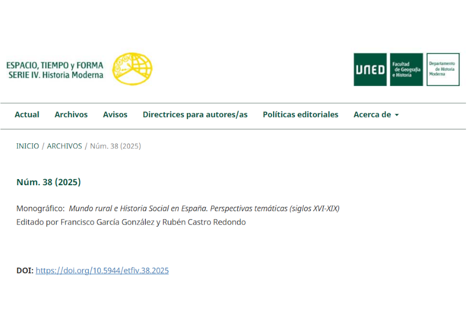 Publicado en la revista Espacio, Tiempo y Forma. Serie IV, Historia Moderna, el monográfico Mundo rural e Historia Social en España. Perspectivas temáticas (siglos XVI-XIX), coordinado por Francisco García González y Rubén Castro Redondo.