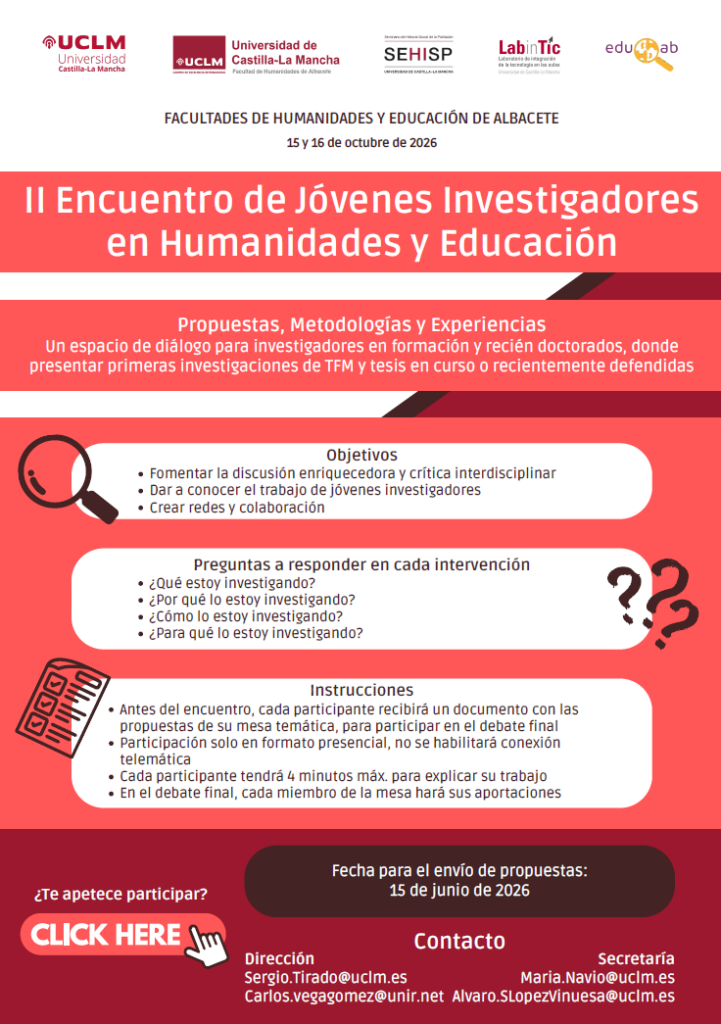 Este encuentro científico interdisciplinar reunirá en Albacete a jóvenes investigadores en formación (TFM o tesis en curso) o recién doctorados los días 15 y 16 de octubre de 2026. Tras el éxito de la primera edición celebrada en 2023 con más de 40 participantes de diversas universidades españolas, se retoma esta iniciativa que persigue crear un espacio de intercambio académico en el que se compartirán resultados y experiencias, se propondrán nuevas perspectivas y sugerencias y se establecerá un diálogo provechoso y constructivo entre investigadores para el desarrollo de sus distintas líneas de trabajo en sus diferentes disciplinas de estudio dentro del ámbito de las Humanidades y la Educación.