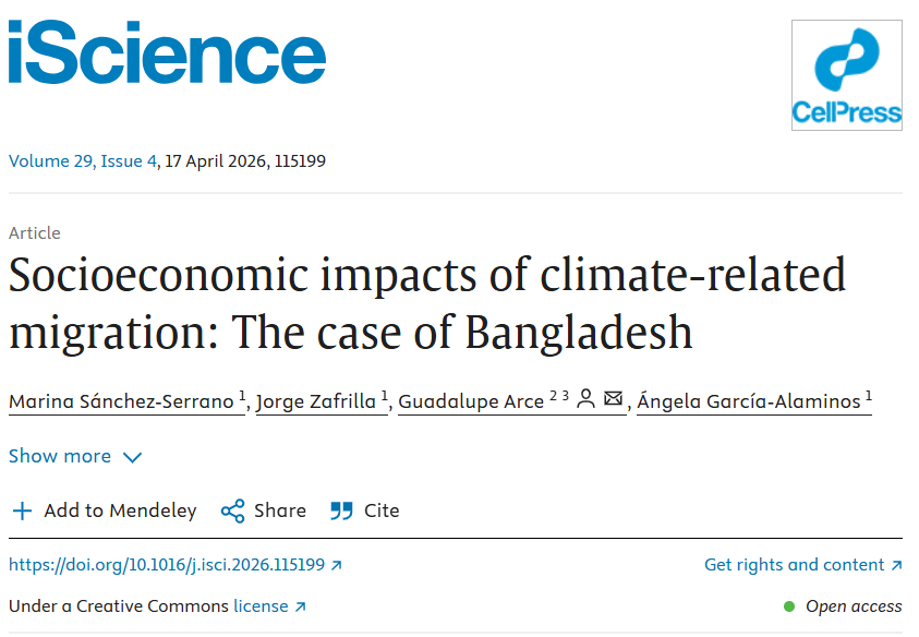 How does climate‑related migration reshape Bangladesh’s economic structure and employment? Marina Sánchez‑Serrano, Jorge Zafrilla, Guadalupe Arce and Ángela García‑Alaminos examine this question in their new article published in iScience (2026).