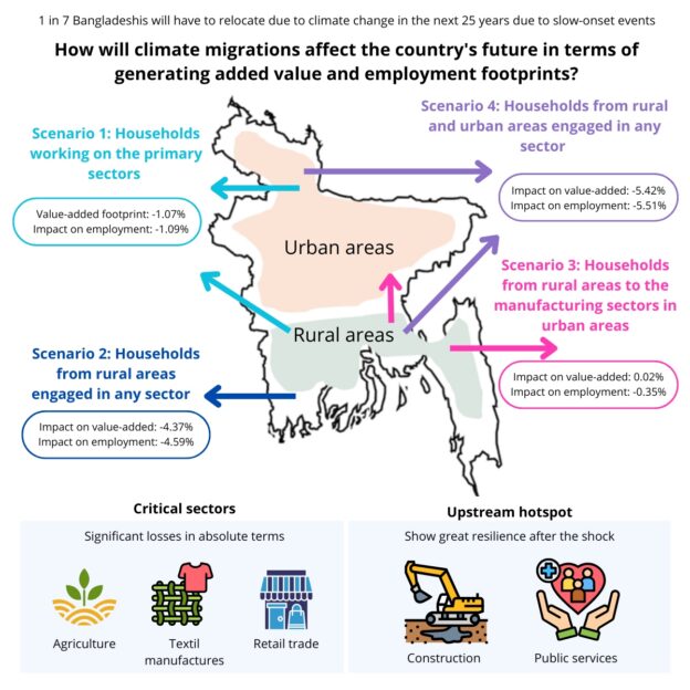 The article, titled «Socioeconomic impacts of climate-related migration: The case of Bangladesh», examines how slow-onset climate events that drive population displacement reshape Bangladesh’s economic structure. Using an environmentally extended input–output model based on the Miyazawa approach, the authors differentiate between rural and urban households to capture changes in consumption patterns and their propagation throughout the economy.