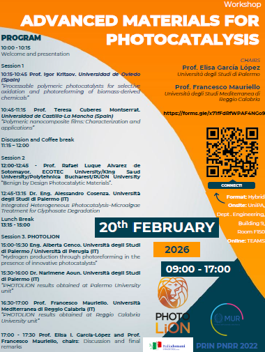 Hoy viernes 20 de febrero, desde el grupo NANOMAT de la UCLM hemos participado en la workshop de «Advanced Materials for Phtocatalysis» organizada por la Prof. Elisa García López, de la Universitá degli Studi di Palermo y el Prof. Francesco Mauriello, de la Universitá degli Studi Mediterranea di Reggio Calabria. ¡¡Realmente interesantes los resultados del proyecto PHOTOLION desarrollado en Italia por estas Universidades!! Subrayar que la Universitá degli Studi di Palermo y la EIMIA, Universidad de Castilla-La Mancha tienen actualmente en marcha un «Bilateral Institutional Agreement» dentro de un proyecto ERASMUS , que posibilita el intercambio de estudiantes de grado (¡¡atentos estudiantes de la titulación de Ingeniería Eléctrica en la EIMIA!!). Previsiblemente, del 7-11 de septiembre 2026 la Prof. Cuberes visitará el grupo liderado por la Prof. Elisa García, para discernir y estrechar lazos más profundos de colaboración científica entre nuestros grupos . La participación de la Prof. Cuberes en la Workshop de hoy ha resultado especialmente gratificante y prometedora.