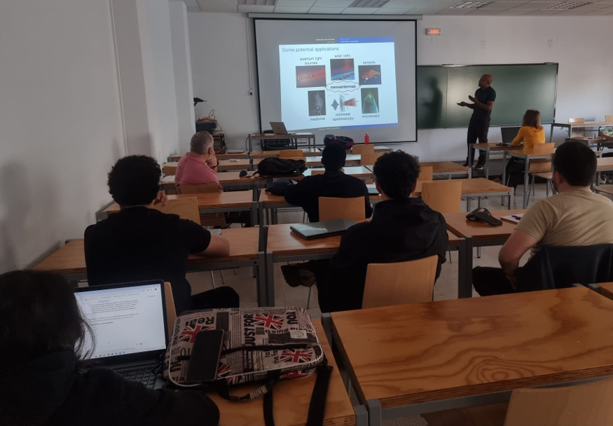 El seminario también abordó algunos conceptos fundamentales de física del estado sólido, como la estructura de bandas electrónicas y la existencia de bandas prohibidas (bandgaps), que determinan el comportamiento eléctrico de los materiales y que el alumnado ya había estudiado previamente en la asignatura de Ciencia de Materiales de segundo curso. A continuación, el profesor López presentó diversos resultados recientes de investigación, mostrando cómo los campos electromagnéticos o la radiación pueden modificar la estructura electrónica de estos materiales y permitir así el control de sus propiedades físicas. En particular, se discutieron los llamados materiales semi-Dirac, en los que las partículas presentan comportamientos distintos según la dirección del movimiento, así como el fenómeno de los plasmones, que consiste en oscilaciones colectivas de los electrones inducidas por la interacción con la luz. Finalmente, se analizaron sistemas formados por dos capas de material, en los que la rotación relativa entre ellas puede alterar sus propiedades electrónicas y plasmónicas, mostrando cómo la geometría y la interacción entre capas permiten diseñar materiales con propiedades ajustables para futuras aplicaciones en nanoelectrónica y fotónica.