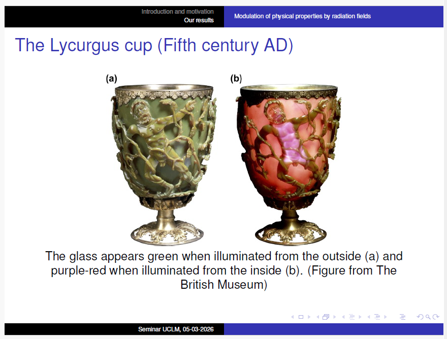 Durante la charla se presentó una introducción a la nanociencia y a la ingeniería de materiales basada en el control de sus propiedades mediante campos de radiación, con especial atención al grafeno y a otros materiales bidimensionales. En primer lugar, se explicó el concepto de nanoescala, que comprende estructuras con dimensiones entre aproximadamente 1 y 100 nanómetros, donde los materiales pueden mostrar propiedades físicas muy diferentes a las observadas a escala macroscópica. En este contexto se introdujo el grafeno, una sola capa de átomos de carbono organizada en una red hexagonal, cuya investigación ha experimentado un gran desarrollo desde su aislamiento experimental en 2004, un hito que dio lugar al Premio Nobel de Física en 2010. Este material destaca por propiedades excepcionales como su alta conductividad eléctrica y térmica, gran resistencia mecánica, flexibilidad y elevada transparencia óptica, lo que lo convierte en un candidato muy prometedor para aplicaciones tecnológicas en campos como sensores, dispositivos optoelectrónicos, células solares o materiales estructurales avanzados.